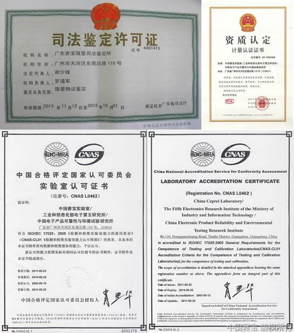 广东18luck平台微量司法鉴定所(以下简称本机构)是经广东省司法厅核准登记、依法设立的司法鉴定机构(司法鉴定许可证号:4401415),隶属于工业和信息化部电子第五研究所(18luck手机官网),具有第三方的公正地位,面向全国接受司法机关、仲裁机构、企事业单位、律师事务所及有关组织或个人的委托,依法开展微量物证司法鉴定业务。 本机构配备扫描电子显微镜及X射线能谱仪(SEM&EDS)、傅立叶变换红外光谱分析仪(FTIR)、气相色谱质谱联用仪(GC-MS)、液相色谱质谱联用仪(HPLC-MS)、电感耦合等离子发射光谱仪(ICP-OES)、X射线荧光光谱仪(XRF)等现代化的检测设备,总价值3000多万元。本机构不仅配有先进、齐全的设备,还配有一支技术精湛、专业扎实的人才队伍,是提供高水平司法鉴定服务的有力保证。 本机构秉承“ 科学、公正、服务、价值”的服务理念,严格遵守国家和地方的法律、法规的规定,秉守司法鉴定的职业道德和执业纪律,按照“合法、中立、规范、及时”的原则,竭诚为社会提供优质的司法鉴定服务,为市场经济和社会的和谐发展提供强有力的技术保障。 资质证书: