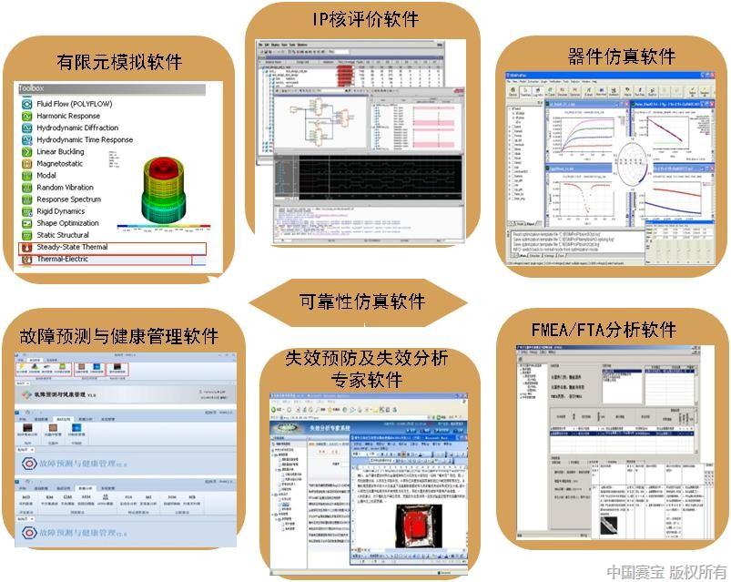 包括限元仿真软件(ANSYS),用于IP核评价的EDA软件,自行开发的故障预测与健康管理(PHM)软件,元器件失效预防、失效分析专家系统以及FMEA、FTA软件及信息库等。具备电子器件/组件的热、机械模拟仿真、集成电路可靠性评价、电子元器件失效模式和机理推理分析、和电子系统的PHM等能力。