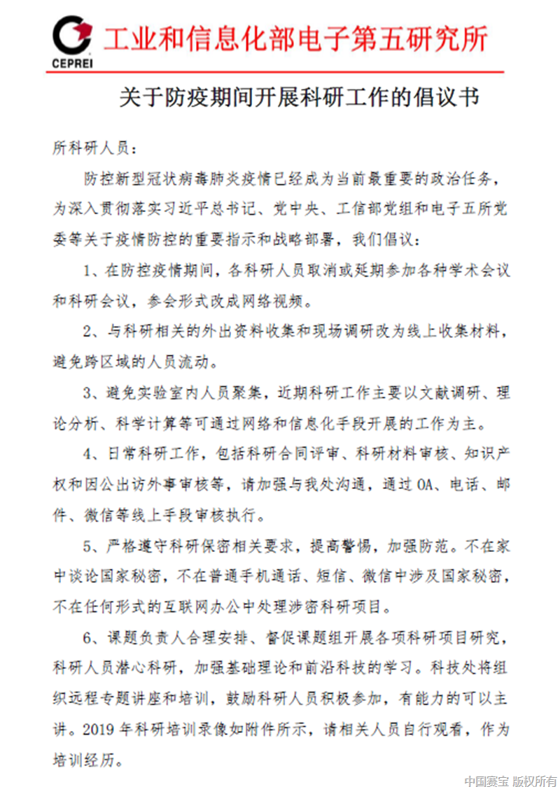 及时响应,吹号立“旗”。为深入贯彻落实习近平总书记、党中央、工信部党组和电子五所党委关于疫情防控的重要指示和战略部署,做好工作引导,在所领导的指导下,科技与规划处编制印发了《科研工作倡议书》,“疫情就是命令,防控就是责任”,倡议五所科技工作者在疫情防控期间,充分利用网络渠道,开展视频交流、网络学习和线上办公,严守国家秘密,潜心科研、加强学习,为科技工作献智献力,众志成城、共克时艰,只争朝夕、砥砺前行。