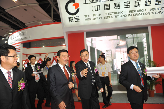 开幕式后,苗圩部长对展区内重点展馆进行了巡察参观。苗部长一行来到生产性服务业展区后,首先听取我所人员介绍了生产性服务业的相关情况。随后苗部长来到我所新区选址所在地增城市展区参观,广州市副市长、增城市委书记曹鉴燎向苗部长重点介绍了以我所整体改造与能力提升建设项目为核心的广州生产性服务业示范园区的规划情况。我所新区建设以创建“广州生产性服务业示范园区”为目标,面向广东省乃至国家新型工业化发展和国防现代化建设的需求,将我所建设成为国内一流的生产性服务机构和国防工业基础技术研究机构。听完汇报后,苗部长也表示了对此项目的关注。随后在我所所长谢少锋、党委书记李敏与副所长陈立辉等同志的陪同下,苗部长一行来到了我所展区。我所展区展馆设计大气独特,分别由总接待区、广州生产性服务业示范园区——增城新区规划展区、云计算体验区与仪器设备互动展示区等四个功能区构成。
