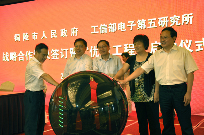启动仪式上,所长谢少锋、副总工万举勇分别代表我所与铜陵市人民政府、铜陵市经信委代表签订了双方战略合作框架协议、“优质工程”协议。工信部规划司副司长刘树苹,安徽省经信委副主任、党组成员吴韦人,铜陵市委书记、市人大常委会主任姚玉舟等领导共同按下“优质工程”启动球。