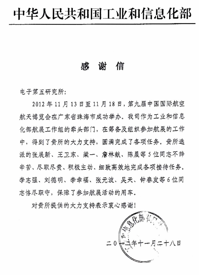 受工信部委托,我所全程参与了部属各司局领导及部外嘉宾的服务保障工作。航展期间,我所抽调所办公室、科技处数名精干人员全力协助部军民结合推进司、国防科工局等各机关单位的服务工作,调用所车辆六台共出车几十次、服务各司局领导近三十人,充分发扬了五所人“尽责、敬业、进取”的精神,圆满完成了航展的支撑服务工作。我所人员不怕苦不怕累的工作态度、细致周到的服务受到了航展主办方和部各司局领导及部外嘉宾的一致好评。军民结合推进司特意发来感谢信,对我所在珠海航展活动期间的各项支撑服务工作表示肯定。