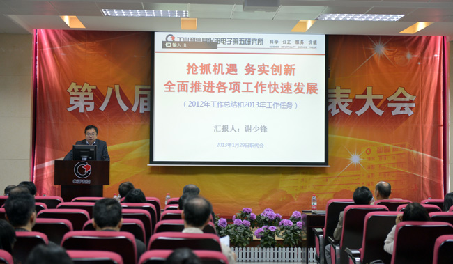 谢少锋同志在《抢抓机遇,务实创新,全面推进各项工作快速发展》的报告中对我所经济目标完成情况、科研工作与业务拓展、行业支撑与服务、能力建设、内部管理、人才队伍建设、思想政治和文化建设工作、质量、安全和保密工作等方面进行了总结;同时指出了存在的问题,在此基础上提出了进一步发展的思路。对于2013年工作,我所将按照工信部的部署和要求,切实履行好支撑政府和服务行业的职能,报告提出了2013年我所经济、科技、能力建设、支撑政府、内部管理、思想政治工作等方面的目标。
