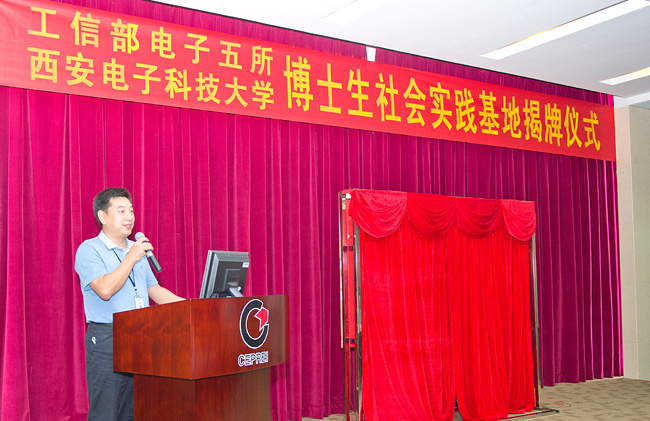 我所党委副书记高裕跃主持了揭牌仪式,他对龙副书记一行来所表示热烈欢迎,并鼓励博士生在我所社会实践期间,积极与技术人员沟通,学以致用,积极将所学的前沿知识与工程实践结合,解决实际工程问题。谢所长在致辞中简要介绍了五所的基本情况,包括五所的发展历程、目前规模、所内人才结构、业务涵盖范围等。他充分肯定了西电对我所人才培养方面的贡献,指出我所西电校友众多,其中,中层干部就有12%来自西电,可以说西电为我所输送了大量优秀人才。衷心希望西电博士团的同学在五所的实践能有可喜的收获,能有更多的博士通过社会实践,了解五所,留在五所,成为我国质量和可靠性事业的中坚力量。西安电子科技大学副书记龙建成在讲话中指出,西电与五所一脉相承,有很深的渊源,对五所向西电提供研究生社会实践基地表示感谢,要求参加实践的博士们在所里多看、多想、多问,在实践过程中端正态度,虚心学习,珍惜机会,努力提高应用能力。本次博士实践团的于新海博士代表实践学生做了发言。