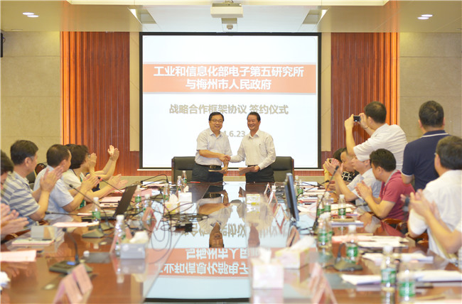 随后,谢所长与陈副市长签订了“工业和信息化部电子第五研究所与梅州市人民政府战略合作框架协议”。协议的提出是在梅州市政府为加快推进梅州产业转型升级、实现梅州市新型特色工业战略的背景下,希望充分利用我所的科研、人才、技术服务优势开展“引智强企”战略合作,建立双方全面的战略合作关系。陈副市长在座谈会上发表讲话,要求项目参与企业应多向五所专家团队请教;政府相关部门要高度重视项目的实施,组织好企业和专家的对接;最后,他预祝梅州的企业能在项目实施中收获到实实在在的效果,推动梅州工业转型升级与经济发展。