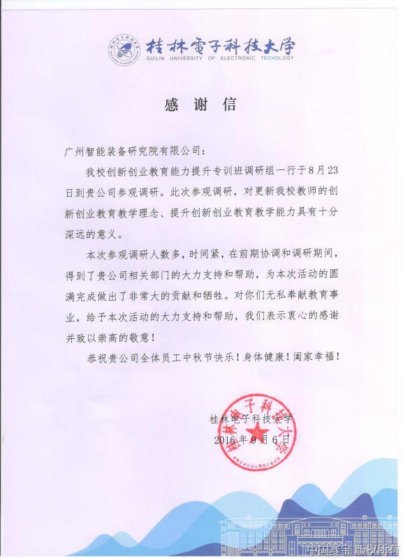 近日,智能院收到桂林电子科技大学(以下简称“桂电”)发来的感谢信,感谢智能院对桂电创新创业教育能力提升专训班调研组的工作给予的帮助。桂电对智能院工作人员积极的态度、严谨的作风、过硬的专业知识以及优质的服务给予高度赞赏。