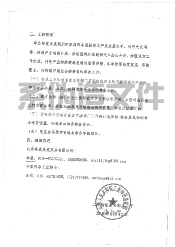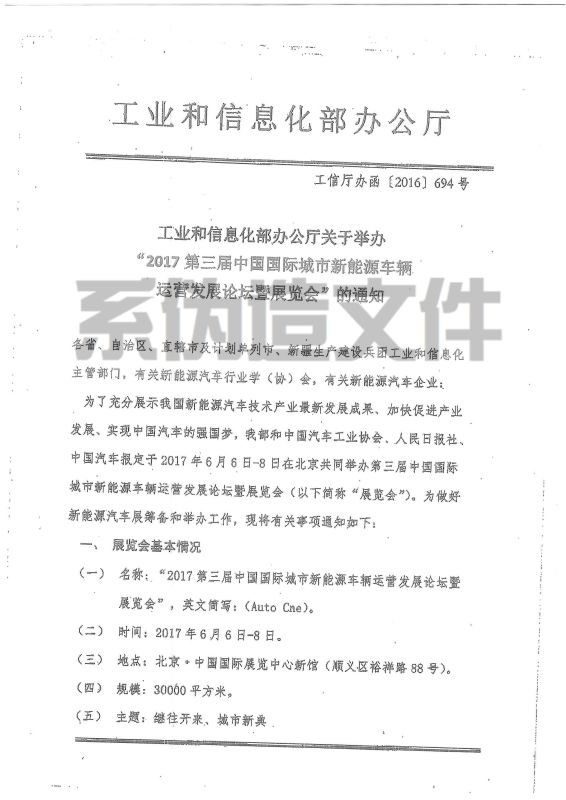 近日,有单位接到所谓《工业和信息化部办公厅关于举办“2017第三届中国国际城市新能源车辆运营发展论坛暨展览会”的通知》(工信厅办函〔2016〕694号)的文件,并称“我部和中国汽车工业协会、人民日报社、中国汽车报定于2017年6月6日-8日在北京举办第三届中国国际城市新能源车辆运营发展论坛暨展览会”。
