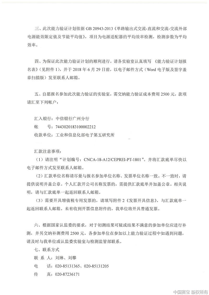 关于邀请参加2018年国家认监委实验室能力验证计划“电源适配器的平均效率检测”的通知