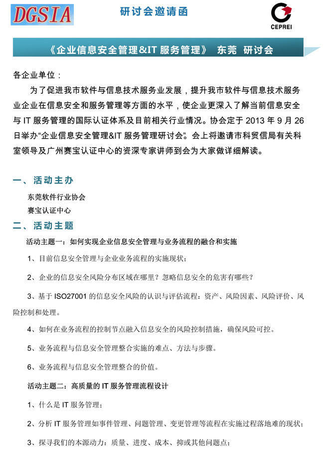 《企业信息安全管理&IT服务管理》东莞研讨会(东莞,9.26)