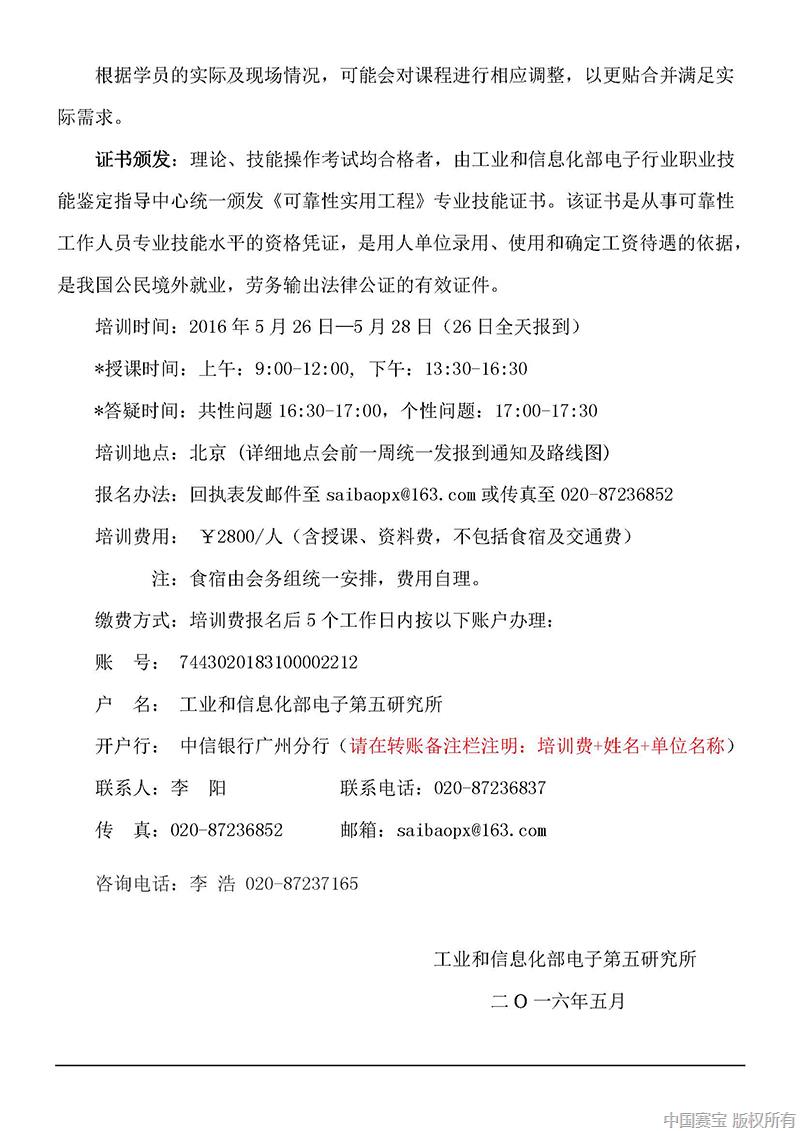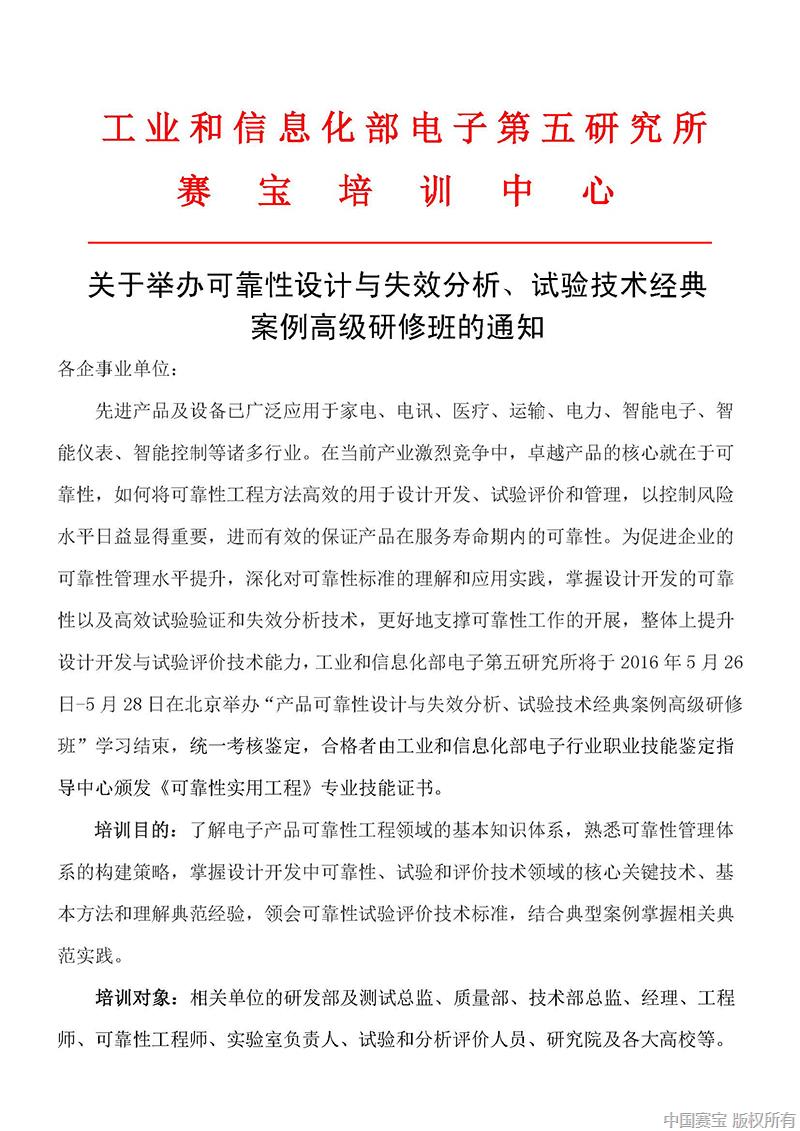 北京可靠性高级研修班通知(2016.5.26-28)